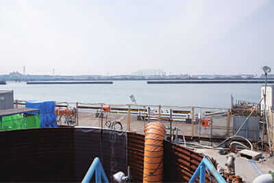 衣浦港の推進立坑。奥に見えるのは三河湾の河口付近。現在、社員3名、溶接工2名、その他5名の合計10名で高・中圧2条の配管作業が進められています。